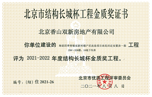 喜讯!由北京香山双新房地产有限公司建设的海淀区四季青镇双新村棚户区改造项目农民回迁安置房一期(29#~32#楼、1#地下车库)工程,荣获2021-2022年度北京市建筑结构长城杯金质奖工程。