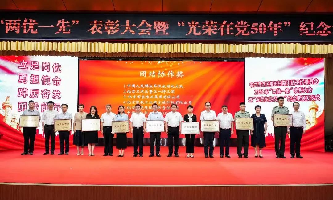 砥砺初心担使命,踔厉奋发勇作为。在中国共产党成立102周年之际,6月28日上午,田村路街道隆重举行“迎七一 树典型 学先进”2023年“两优一先”表彰大会暨“光荣在党50年”纪念章颁发仪式。海淀区政协副主席、田村路地区党建工作协调委员会主任李伟,区委组织部副部长孔磊,区委宣传部副部长刁伟梅,田村路街道及各基层党组织、地区单位代表等参加活动。会上,北京龙徽国际酒文化创意产业有限公司作为地区党建工作协调委员会成员单位代表,受邀上台荣获了团结协作奖奖牌。